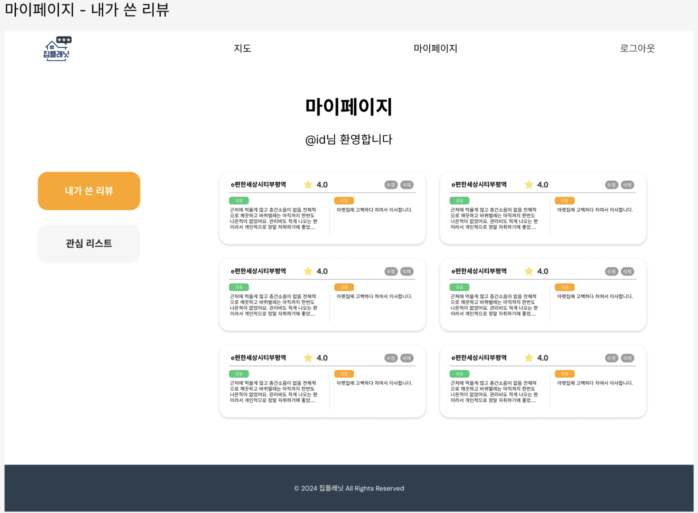 - 마이페이지: 장세희 (나) - 내가 쓴 후기와 찜한 집 목록을 관리할 수 있는 마이페이지를 구현합니다.